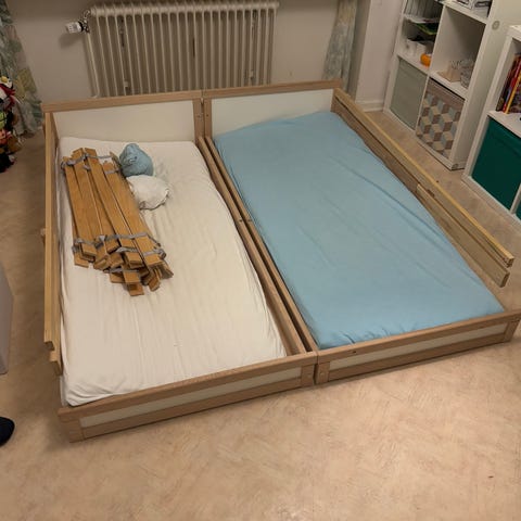 Skänker bort 2 st sängar 90×200. Inkl ben men inga madrasser. De står utanför garage under tak, bara att hämta!