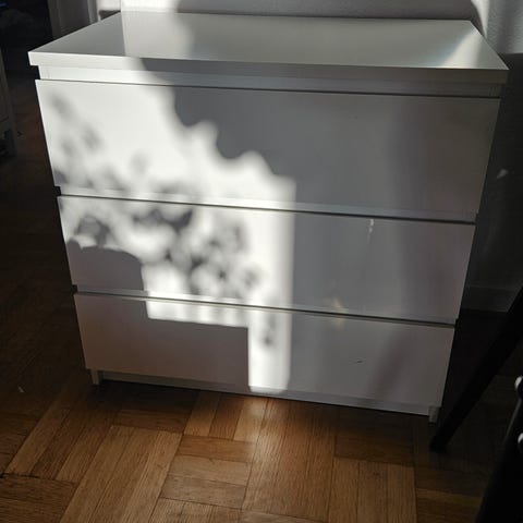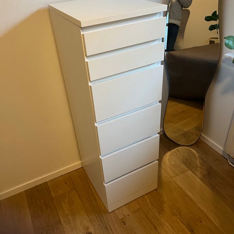 Sexlådig byrå i vitt, topp med uppfällbar spegel. Ikeas populära Malmserie - denna modell har utgått. Perfekt i hall eller sovrum.
