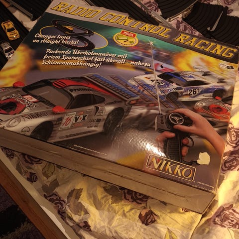 Säljer en Slot Racing bilbana i skala 1:43. Komplett set med två bilar och två handkontroller. Perfekt för barn eller familjespel.