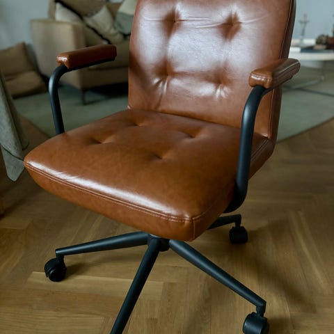 Rostfritt stål och vitt veganskt läder med fem hjul för rörlighet.