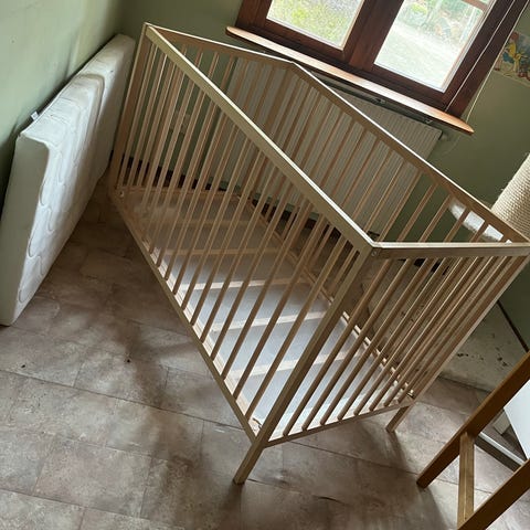 Hej! Jag säljer vår Sniglar spjälsäng (bok) plus 4 stycken dra-på-ladan plus 1 madrasskydd.