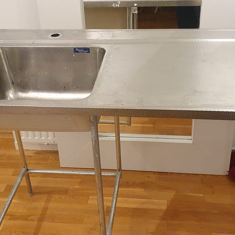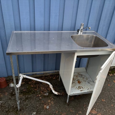 Diskbänk som använts i tvättstuga med som nu ska renoveras och därför säljer vi denna. Mycket praktisk med både trådkorgar och skåp med förvaring.