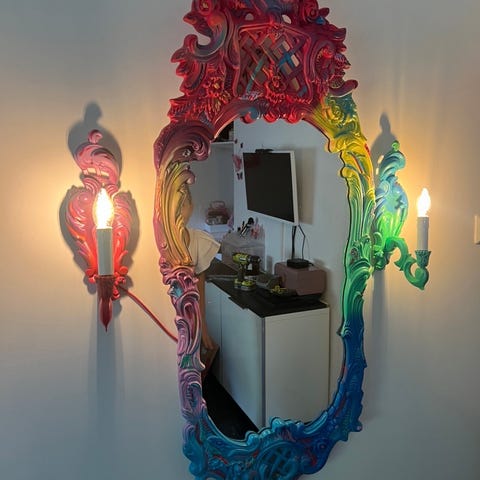 Åhléns Home spegel med en guldfärgad ram. Spegeln har dekorativa detaljer på ramen och är avsedd för väggmontering med en upphängningsanordning på baksidan.