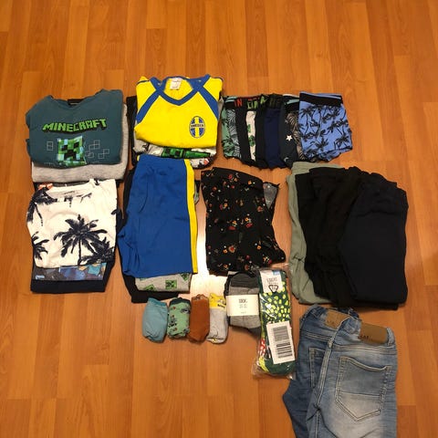 Ett klädpaket med blandade kläder som inkluderar tröjor, t-shirts, byxor, strumpor och tofflor. Bland kläderna finns en grön kamouflagemönstrad tröja, blå t-shirt med Mario-tryck och en grön flanellskjorta. Det finns även Minecraft-strumpor och monstertofflor.