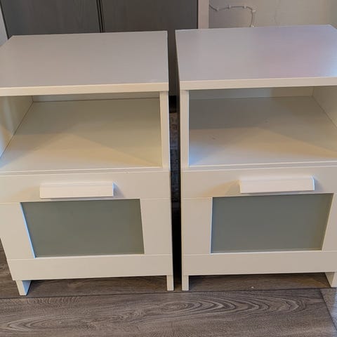 IKEA BRIMNES sängbord med förvaring i vit färg. Möbeln har en öppen hylla samt en låda med front i glas. Passar för användning som nattduksbord eller för förvaring i sovrum.