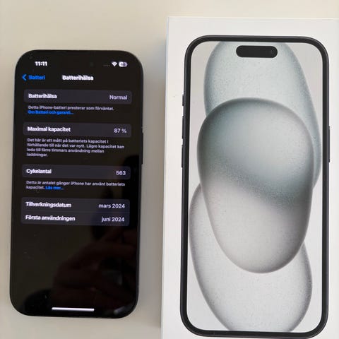 Säljer en Apple iPhone 15 mobiltelefon med 128 GB lagringskapacitet. Telefonen har en mattsvart färg och levereras med originalförpackning. Telefonen är försiktigt använt med skal och skärmskydd och har inga defekter/repor.