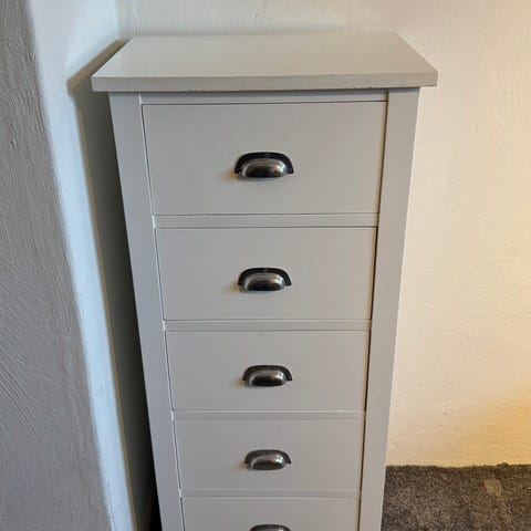 Vit byrå med flera lådor och ett skåp. Möbeln är tillverkad i trä och har metallhandtag. Passar för förvaring i olika rum.