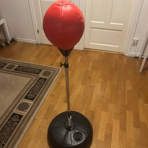 Boxningssäck med stativ i och päronboll i bra skick. Slipp montage i taket med stativet.