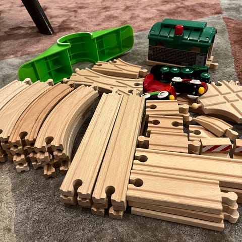 Blandat träjärnvägstågset, bl a BRIO, för barn innehåller olika trädelar inklusive tåg, räls, byggnader och figurer. Setet är tillverkat av trä och är utformat för barn. Innehåller flera färgglada komponenter som kan kombineras för att skapa en järnvägsmiljö.