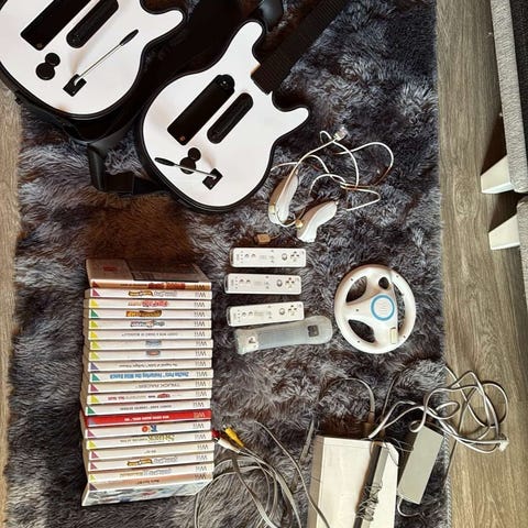Nintendo Wii spelkonsol med tillbehör inklusive två Wii Remote-kontroller, en Nunchuk-kontroller, sensorstång, balance board och strömadapter. Paketet innehåller även sex spel: Wii Play, Just Dance 2, Super Mario Galaxy, Wii Fit mm.