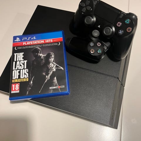 Sony Playstation 4 spelkonsol inklusive en spelkontroll och tre spel: Uncharted, Uncharted 4 och The Last of Us Part II. Konsolen är svart och levereras med nödvändiga kablar för anslutning och strömförsörjning. Kontrollen lite sliten (bild) men fungerar fortfarande väldigt bra. HDMI kabel - anslutningskabel.