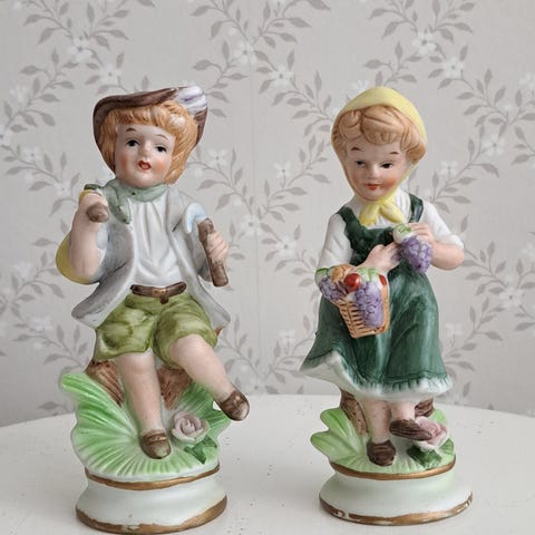 Figuriner tillverkade i porslin, föreställande en kvinna och en man, detaljerade och målade i mjuka färger.