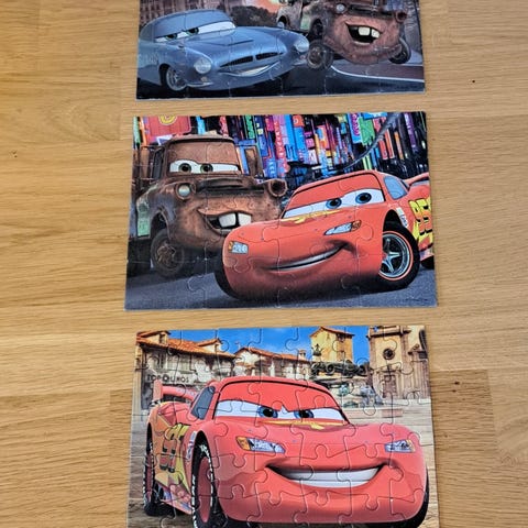 3 Hello Kitty pussel gör barn 3-5 år. Översta är i trä, i 30 bitar. De två nedersta i kraftigare kartong, 48 bitar.