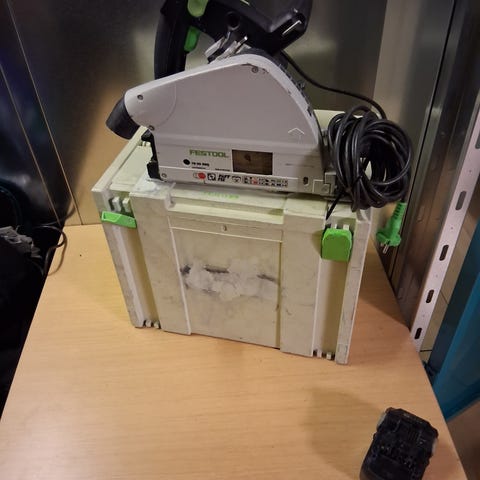Festool TS 55 REQ med tillhörande förvaringslåda, extra sågklinga för stenskiva och elkabel. Sågen är avsedd för exakta snitt i trä och andra material.