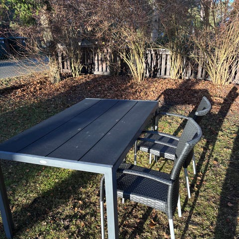 Utemöbelset bestående av ett runt bord med glasbordsskiva och två stolar med metallram
