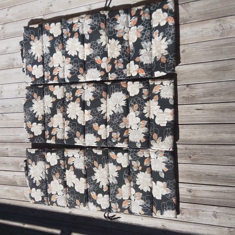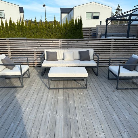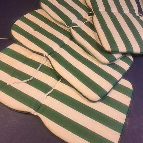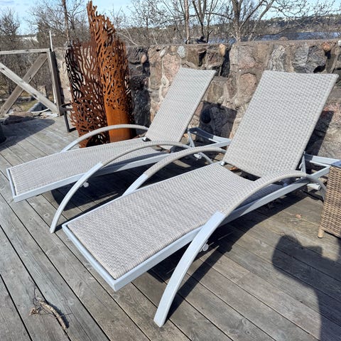 Svart-vita solfåtöljer. 4 st med 4 en gångs använda dynor. En utav fåtöljerna har en liten utbuckling.