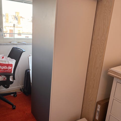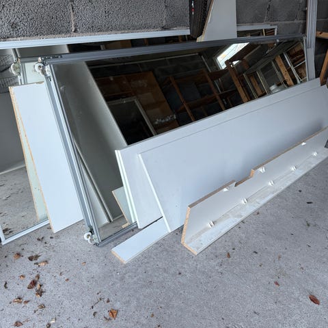 Bortskänkes - en rymlig och stilren garderob med skjutdörrar i blank svart finish.