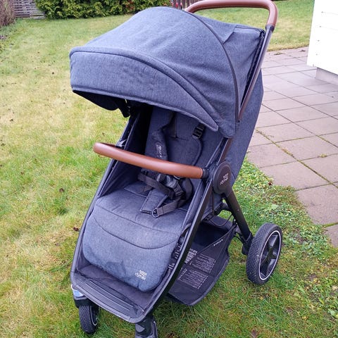 Barnvagnen har en vadderad sittdel och ett skyddande handtag.