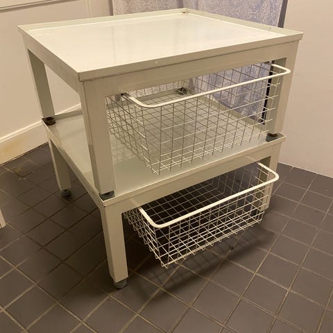 Har stått under tvättmaskin och fått en missfärgning som dock täcks av maskinen. Korgen har blivit skavd när den dragits ut och in. Själva ställningen ser annars ut som ny.