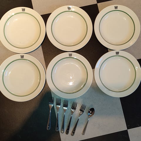 Gustafsberg tallrik med en dekorativ silverkant. Tallriken är vit med en mönstrad silverdekor runt kanten. Passar för servering av mat vid olika tillfällen. Önskar köpa minst 4 stycken, helst flera