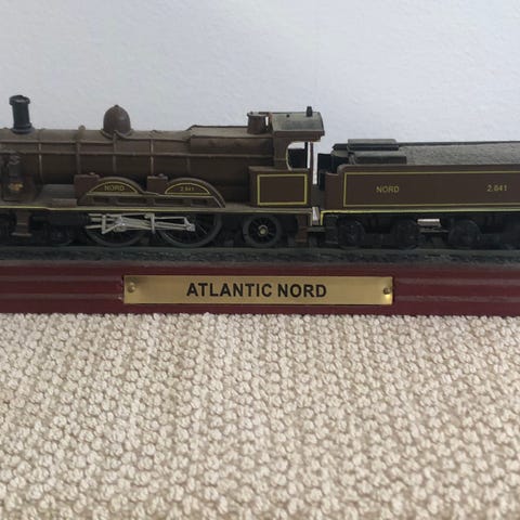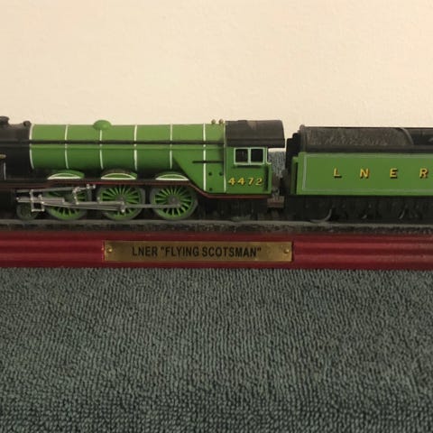 Modell av Henschel Wegmann 232. Kommer på en bas med en skylt.
