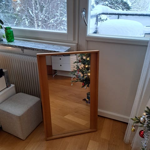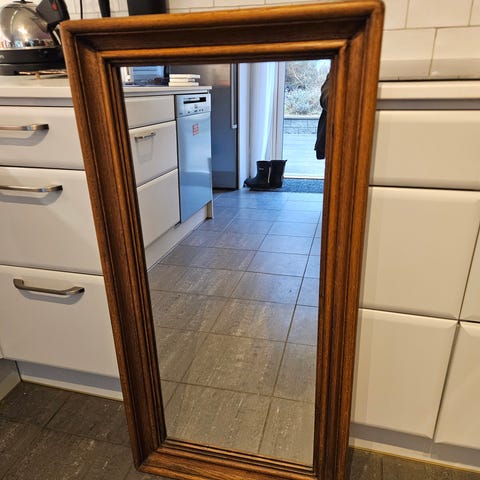 Spegel "Rosita" Fröseke AB Nybrofabriken från 1900-talets mitt med träram. Säljs på Bukowskis auktionen för 3000 som ett utropspris. Spegeln är rektangulär och har en enkel design som passar för användning i olika rum såsom hall, sovrum eller vardagsrum. Där är i Ek och har måtten 93/41 och 97/45 som totalmått. Spegeln är i otroligt bra skick och har max lite smutts på ramen.