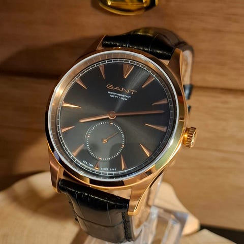 GANT herrklocka med grön urtavla, datumvisning och stållänk. Klockan är vattentålig upp till 100 meter och har en robust design med metallboett och länk i rostfritt stål.