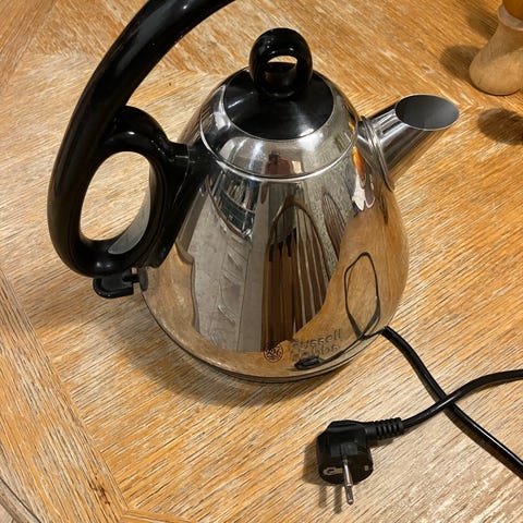 Russell Hobbs vattenkokare i svart färg. Utrustad med handtag och vattennivåindikator. Elektrisk anslutning för uppvärmning av vatten.