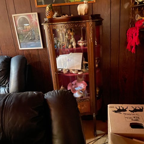 Vitrinskåp tillverkat i trä med två glasdörrar och dekorativa utskärningar i överkant. Skåpet har två hyllplan för förvaring och display av föremål. Färgen är grå med en patinerad yta.