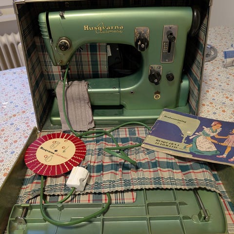 Husqvarna Automatic i bra skick.Den är helt genomgången med rengöring, smörjning, kontroll av funktioner och provsydd (se bild). Dessutom har jag försett den med kabel med skyddsjord. Så säker att använda. Har även monterat nya gummifötter som maskinen står på.