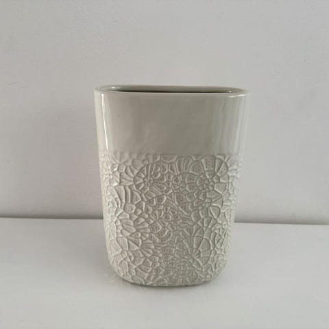 5.0 Två beiga krukor med gulddetaljer. 17 cm diameter. Höjd 22 cm