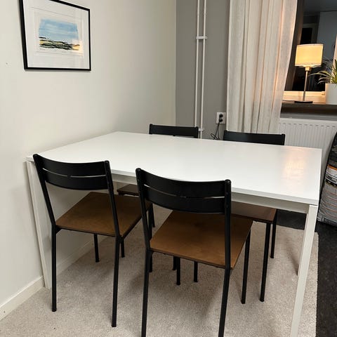 Mio matgrupp bestående av ett vitt bord med en klaffskiva och fyra vita stolar med korsrygg. Stolarna har röda sittdynor.