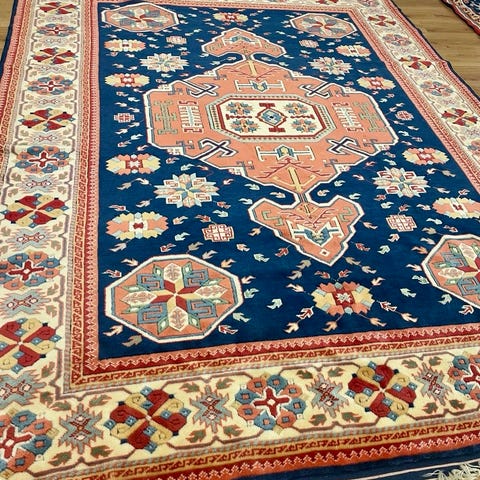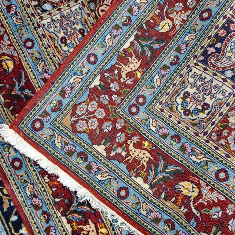 2 st Vackra persisk mattor med mörkblå botten, klassisk medaljong och rikt detaljerat mönster i beige, guld och turkosa toner. Tidlös design som passar perfekt i vardagsrum eller matsal.