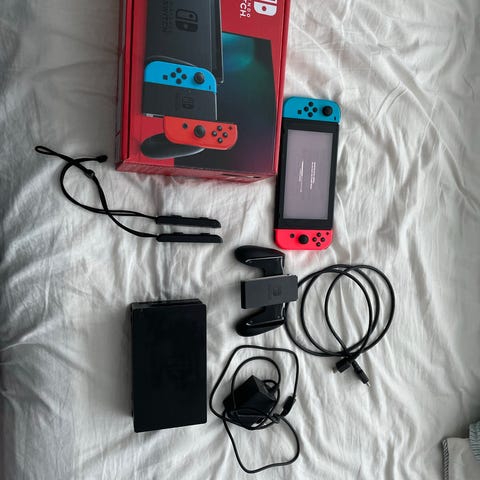 Nintendo Switch spelkonsol med bärbar och stationär funktionalitet. Enheten har en pekskärm och avtagbara Joy-Con-kontroller i svart. Passar för spel på språng eller ansluten till TV via dockningsstation.