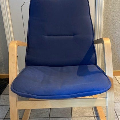 Mysig, mjuk fotölj i ull. Köpt från Ikea. Lite slitage och en fläck. Superskön att sitta i.