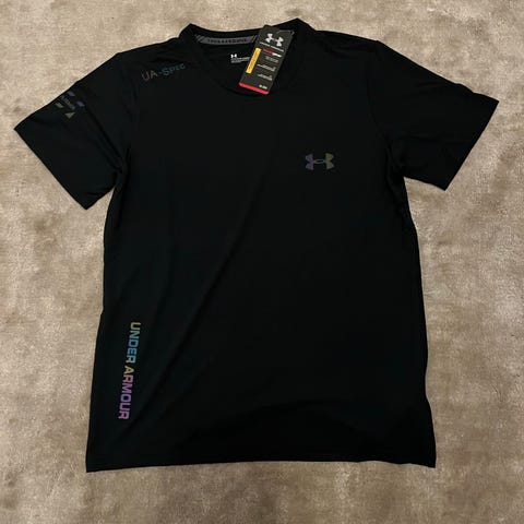 Under Armour träningsoverall för herrar i storlek M. Setet består av en svart huvtröja med dragkedja och matchande svarta byxor. Material och specifika tekniska egenskaper är inte angivna. Passar för träning och vardagligt bruk.
