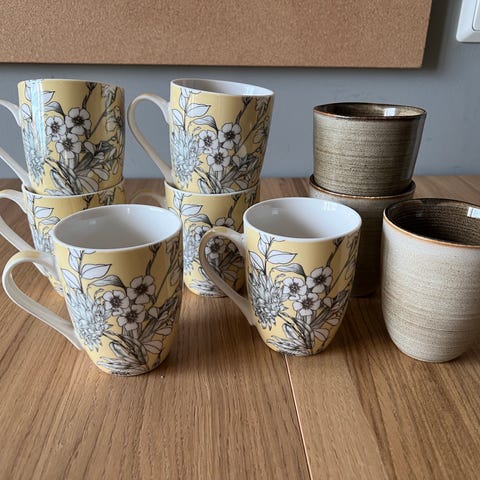 Olika sorter av kaffemuggar och vattenflaskor, bl IKEA 1 L och 0,5 L och drinkblandare