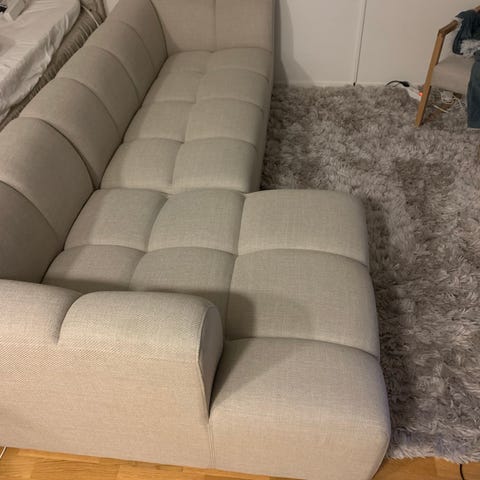 Den är aldrig använd, bara uttagen ur kartongen. Jag köpte hela soffan men den fick inte plats i mitt vardagsrum, så denna del blev över.