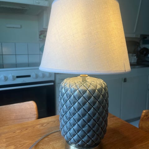 Lampan är ny och oanvänd. Lampskärmen är cylindrisk och klädd i textil, i en dov lila/plommonfärgad ton som skapar kontrast mot den ljusa foten och bidrar till ett varmt, stämningsfullt ljus. Kombinationen av strukturerad keramik och enfärgad tygskärm gör att lampan upplevs som både modern och hemtrevlig.