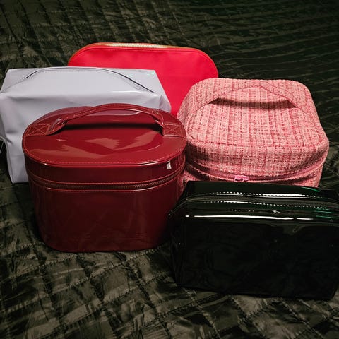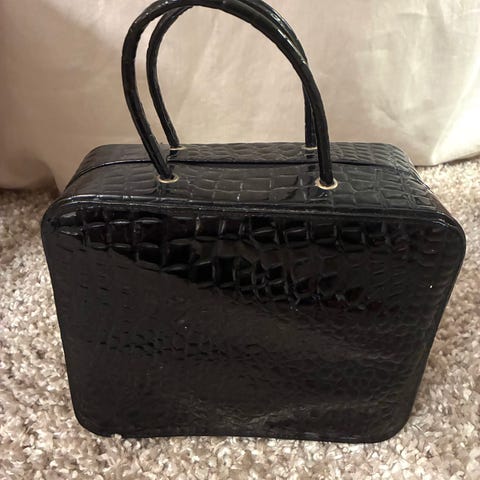 Vacker och rymlig i mörkröd sammet med liggande rosett. Två fack: ett grundare och ett djupt.
