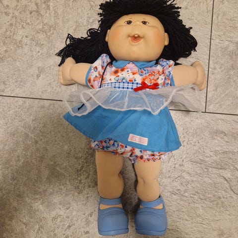 Docka från 1970-talet med en massa hemstickade dockkläder som tillbehör.