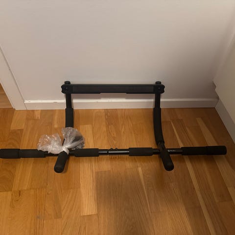 Träningsredskap Pull Up Bar för dörrkarm. Svart färg, tillverkad i metall. Används för övningar som pull ups och chin ups. Passar för hemmaträning och kan monteras i de flesta dörrkarmar.