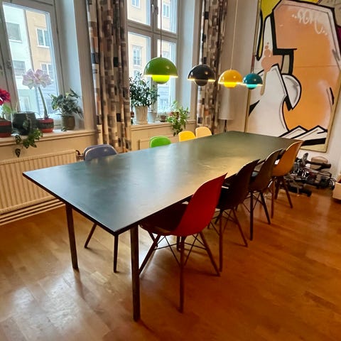 Stabil och robust konstruktion i metall. Passar bra som arbetsbord, matbord eller för garage/verkstad. I gott skick.