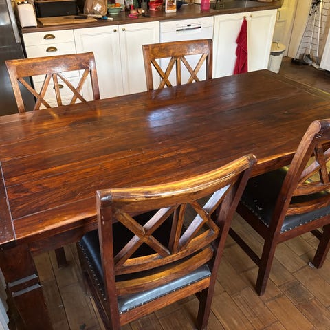 Massivt furuträ matbord med tillhörande 6 stolar. Bordet har en naturlig träfinish och är lämpligt för köks- eller matsalsbruk.