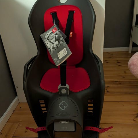 Till salu är en Hamax Caress X1 cykelbarnstol med inbyggd fjädring för montering på pakethållare. Använd max 5 gånger och därmed i stort sett nyskick. Alla originaldetaljer medföljer, inkl. 2 st nycklar. Emballage saknas.