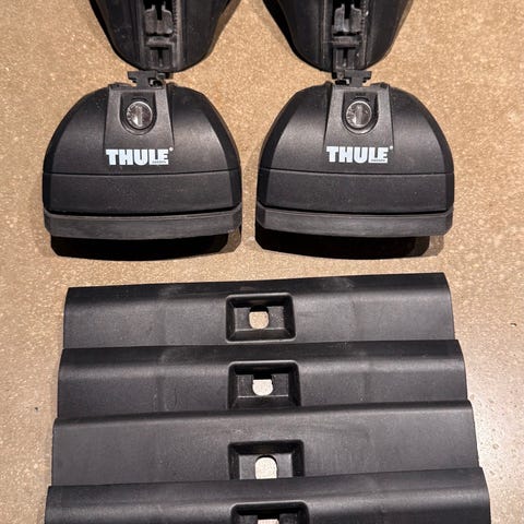 Thule-takräcke (fot-754, Thule-kit-370, Thule-squarebar), samtliga delar i mycket gott skick och har använts enbart några gånger. Fästena passar till bilar utan taklist, exempelvis för Honda CR-V.