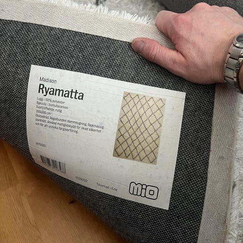 Mattan är använd i ett lekrum, i ett rök- och djurfritt hem. Mattan är av god kvalitet och med fin färg som man blir glad av. Den har en fläck (som också finns med på bild), därav det låga priset.
