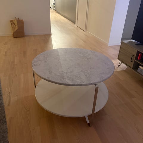 Runt soffbord med underrede i svart metall. Skivan går att vända för marmor/ek imitation. Passar flera inredningsstilar. Fint skick.