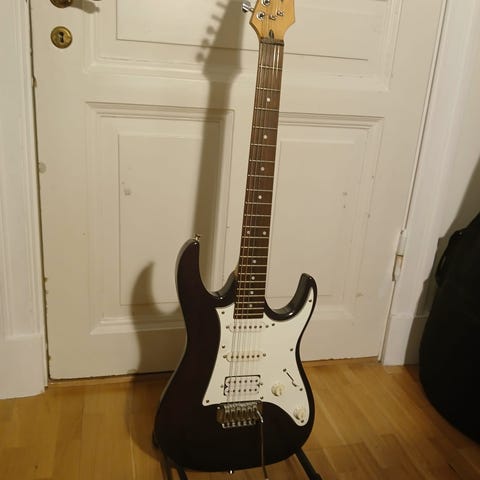 Potentiometrar behöver bytas. Översadel behöver bytas, jag skickar med en sadel. Bryggan behöver ses över. Jag hade antingen bytt den till en toploaded brygga i fender stil för att få stränghöjden lagom, alternativt shimmat nacken. Halsen är fin men har en liten skråma på ca 1mm djup. Svartmålad med patina.