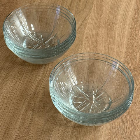 Kosta Boda skålar i glas med mönster i rosa respektive blå färg. Skålarna har en rund form och är lämpliga för servering eller dekoration.